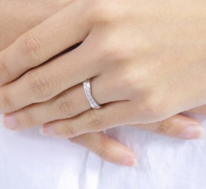 ダイヤモンドが右肩あがりに半周留まるクロスラインリング。