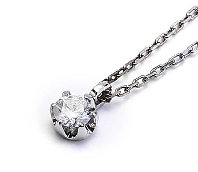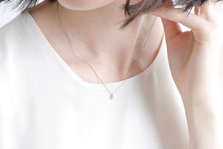 日常的に使いやすいシンプルな一粒ダイヤ0.1ctと、細めのプラチナ850チェーンが放つ、落ち着いた可愛さと高級感がポイント。