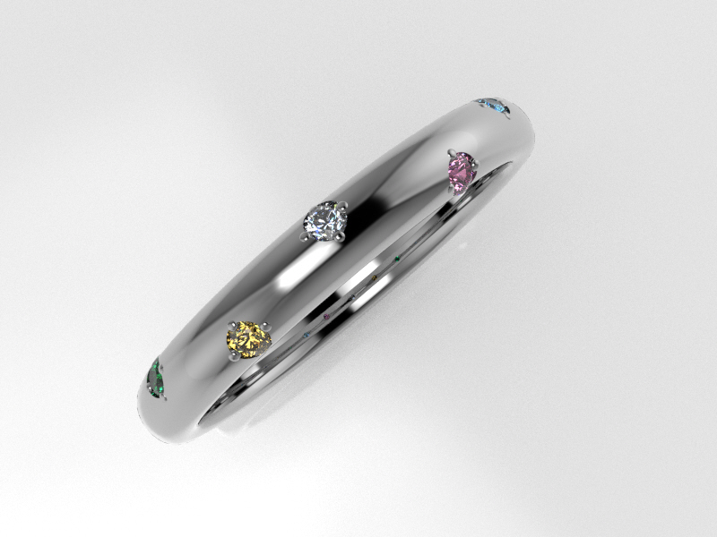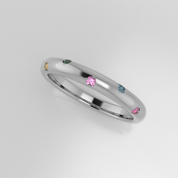 2.5mm幅甲丸ストレートリングに可愛らしい、色鮮やかな天然石たちが華やかな雰囲気を放ちます。